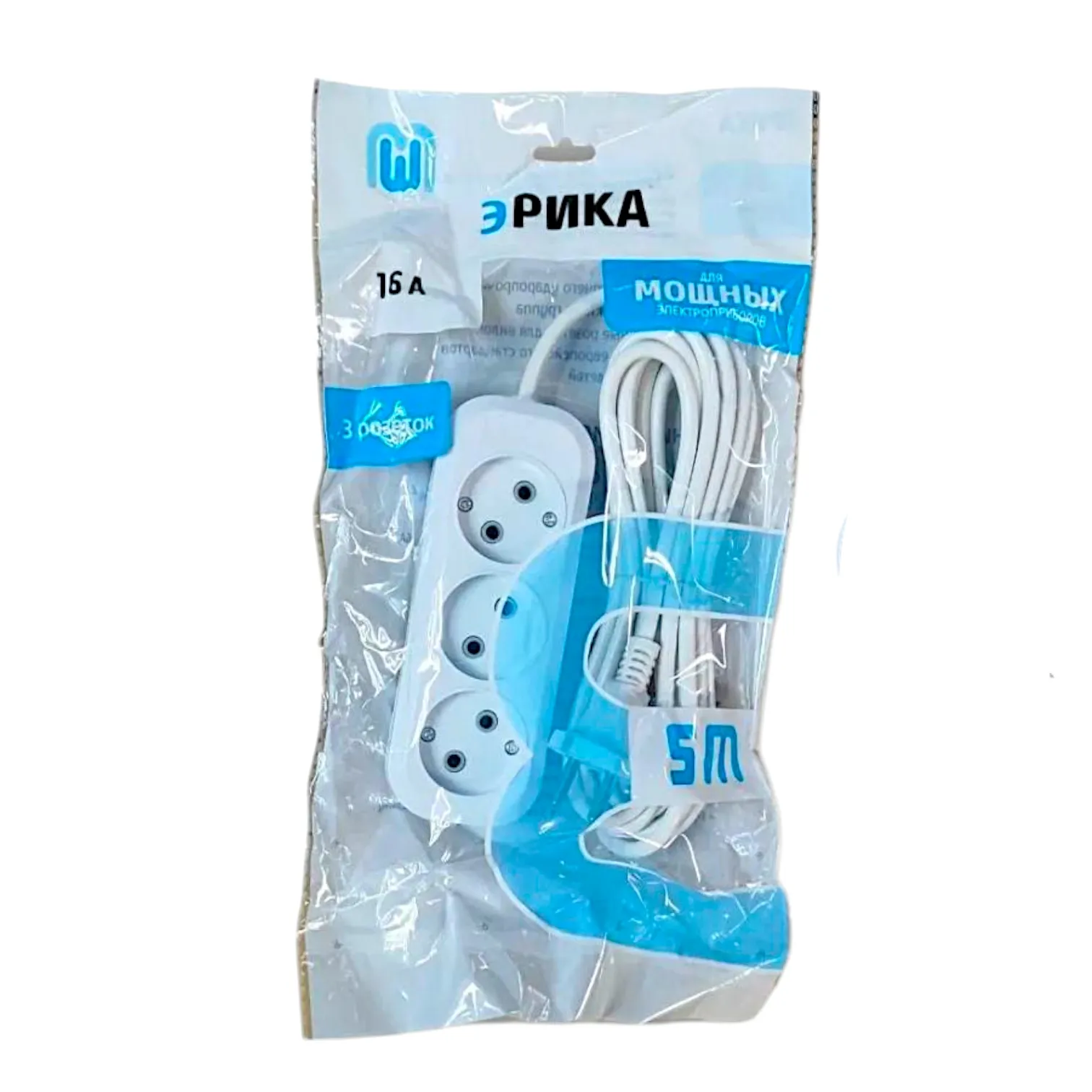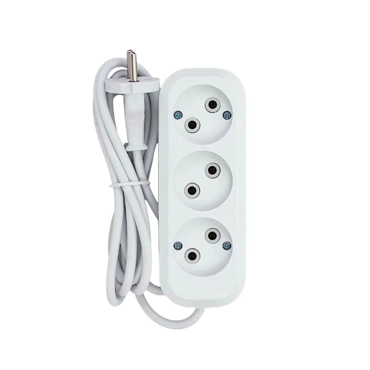 Сетевой электрический удлинитель 5 метров от "MAXIMUM QUALITY TOOLS" имеет 3 розетки на подключение к сети переменного тока. Белый корпус из негорючего АБС-пластика подходит для использования только внутри помещений.