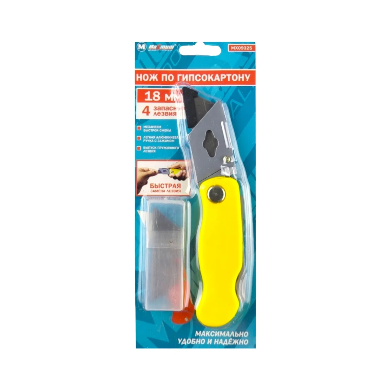 Нож по гипсокартону с запасными лезвиями — это удобный складной инструмент с рычажной кнопкой и системой Quick Change для быстрой смены лезвий.