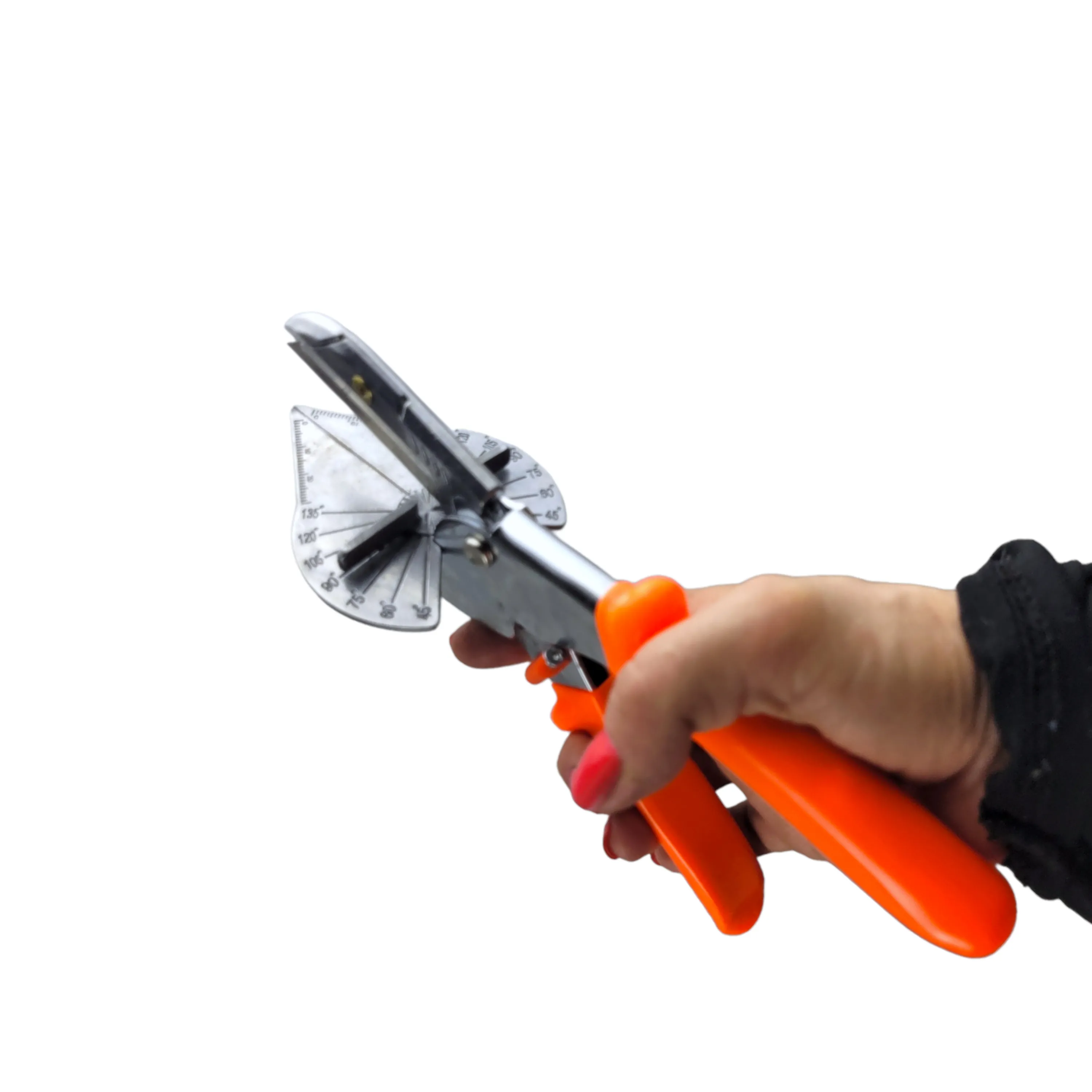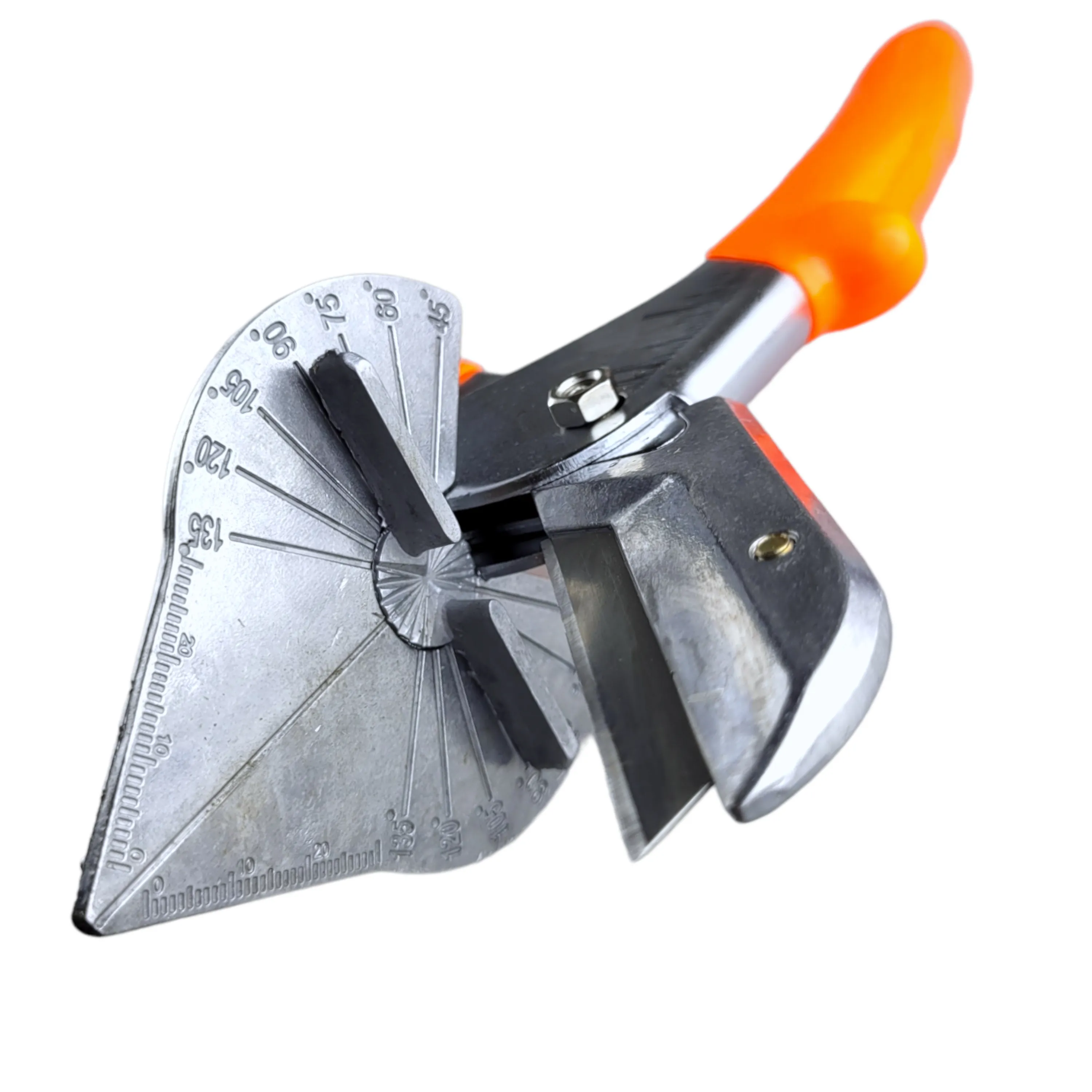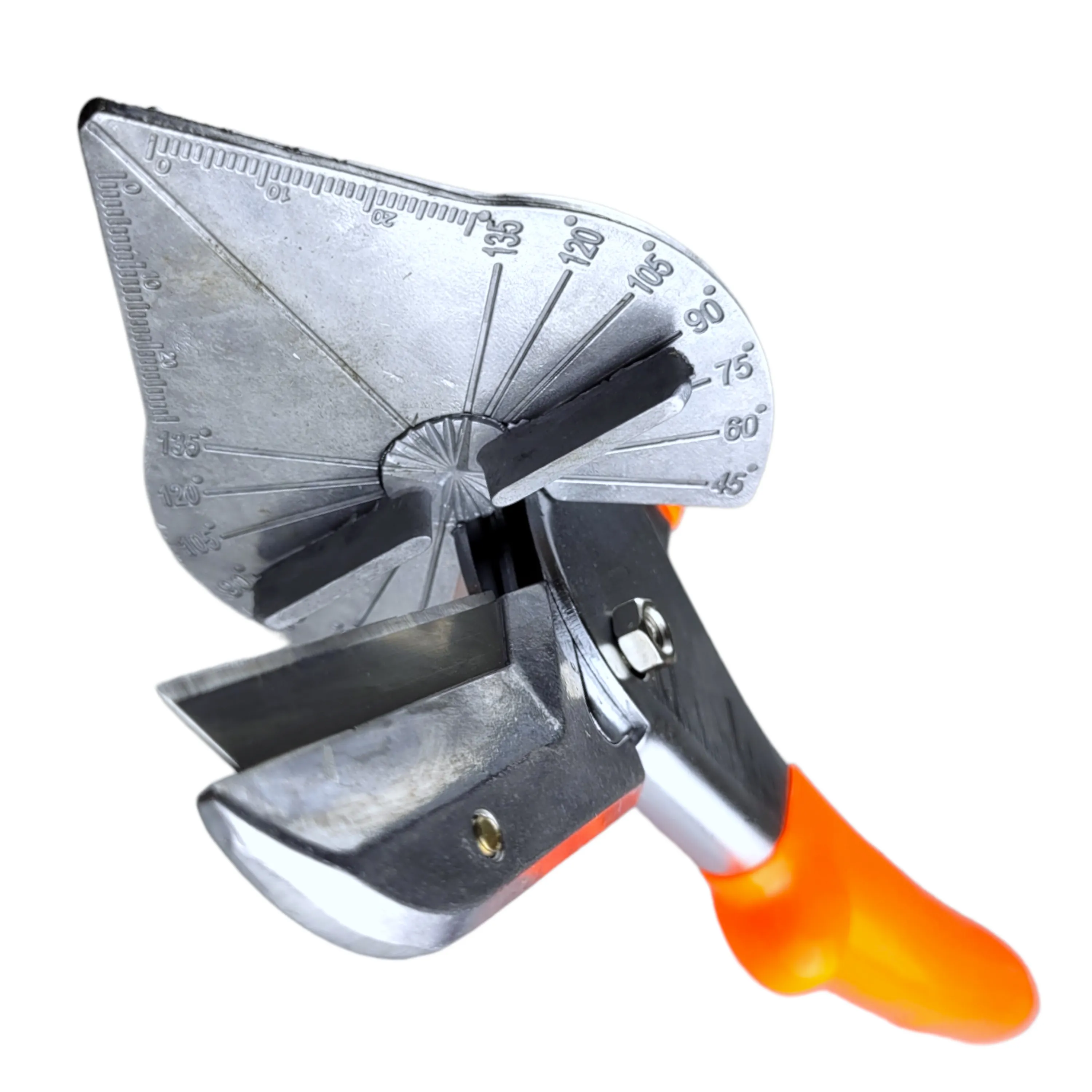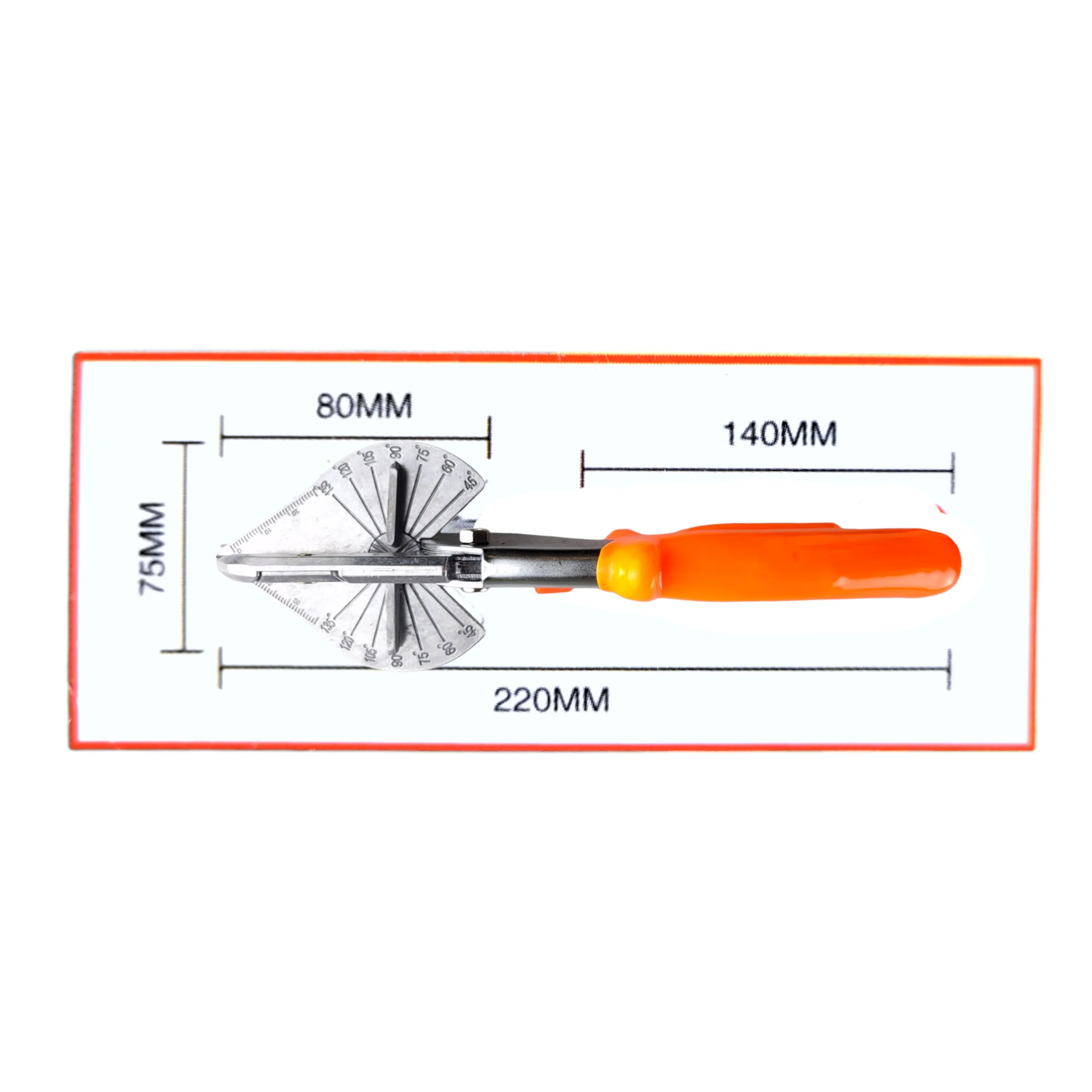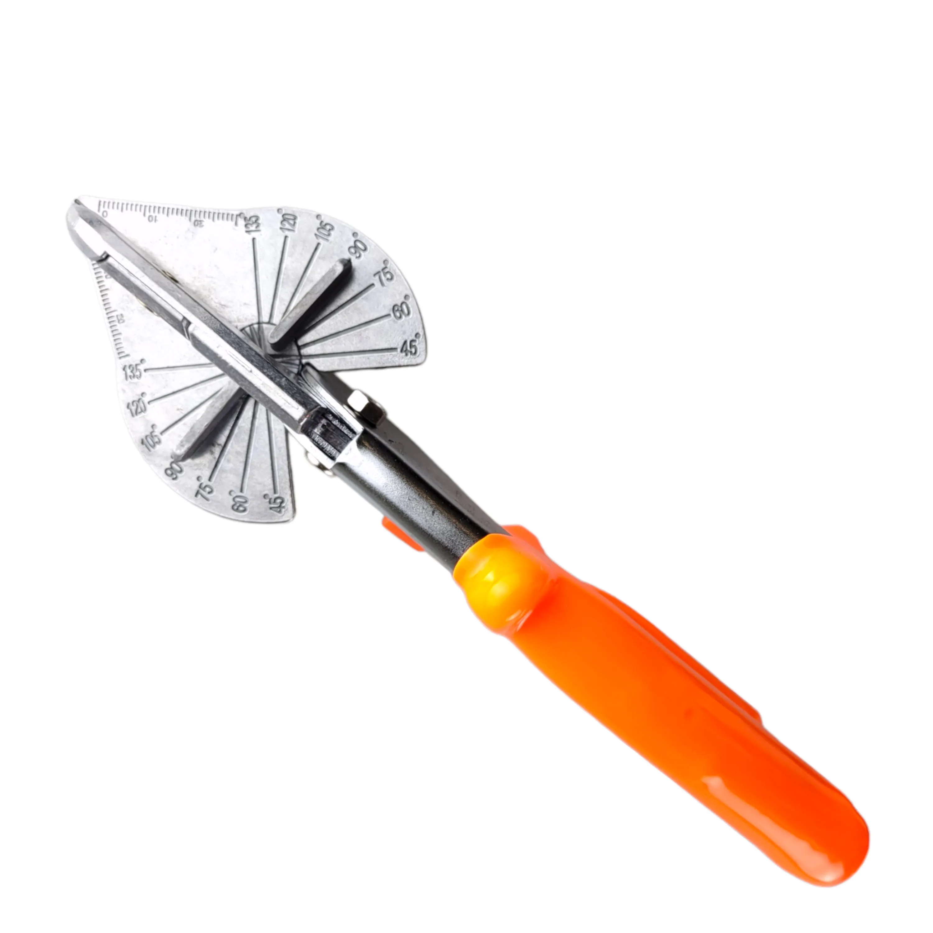 Угловые ножницы со сменным трапецевидным лезвием предназначены для резки пластика, резины, линолеума, картона и тонкого листового металла. Ножницы применяются для резки под заданным углом для дальнейшей точной стыковки в рабочей зоне. Угол реза корректируется перемещением направляющей планки и фиксируется под углом с шагом 15 градусов. Строительные ножницы 220 мм. оборудованы опорой с вмонтированным угольником для резки от 45° до 135° градусов. Специальный замок обеспечивает надежное хранение хранение инструмента. Рукоятки с упорами для пальцев имеют мягкое резиновое покрытие.