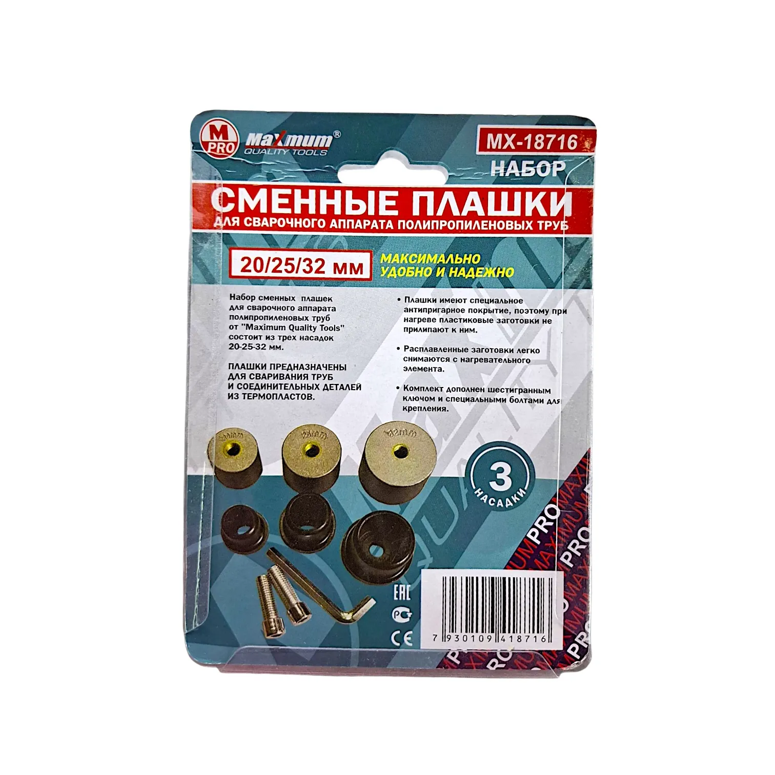 Это комплект из трех сменных плашек (насадок) для муфтового сварочного аппарата (паяльника для полипропиленовых труб). Плашки предназначены для одновременного прогрева внешней поверхности трубы и внутренней поверхности фитинга (муфты, уголка, тройника и т.д.) перед их соединением.