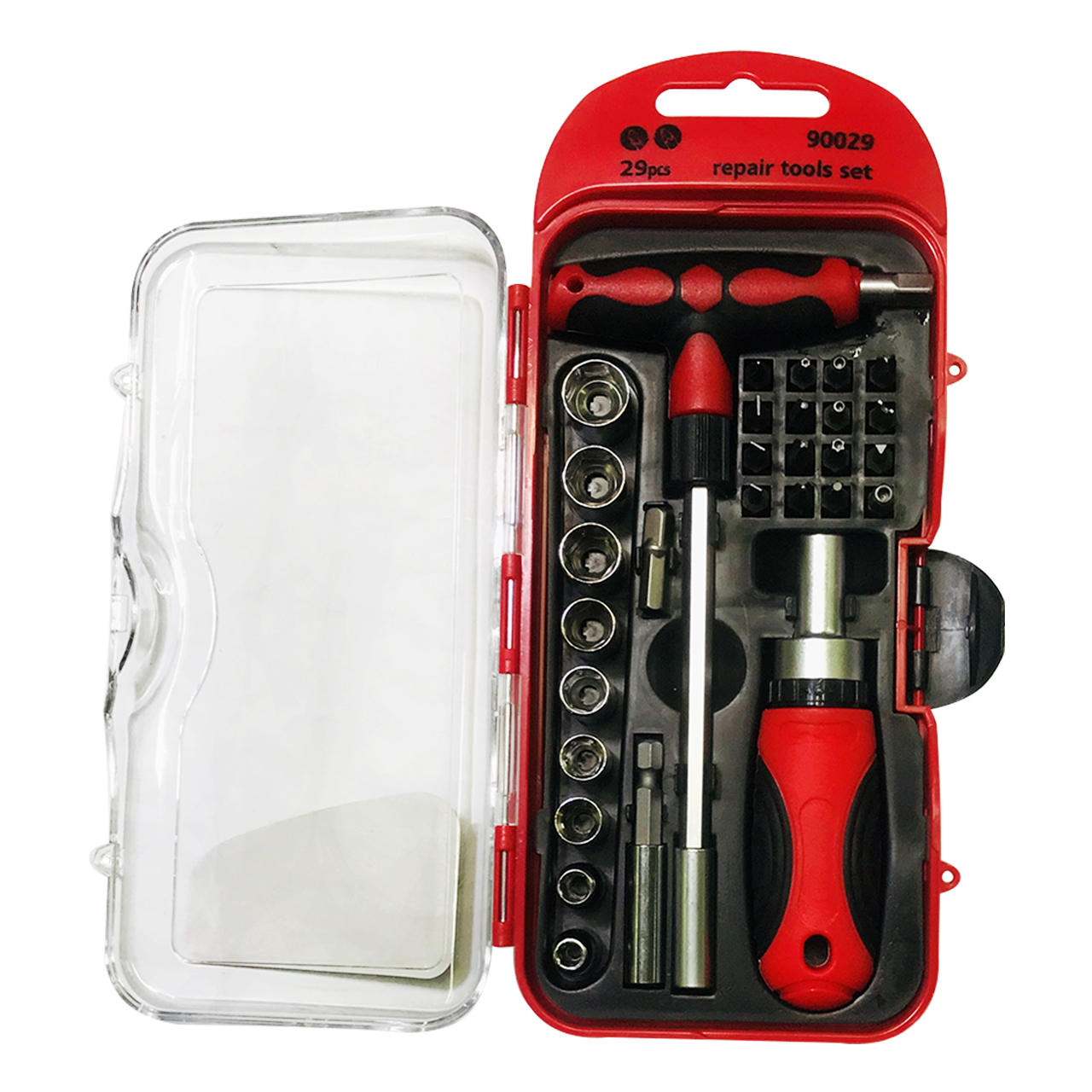 Т-образная рукоятка, отвертка с храповым механизмом, 16 бит, 9 торцевых головок, удлинитель бит, насадка шестигранник.