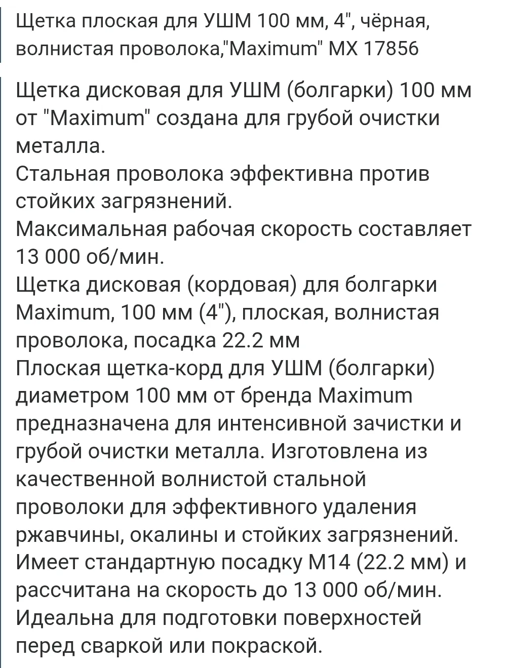 Щетка дисковая для УШМ (болгарки) 100 мм от "Maximum" создана для грубой очистки металла. Стальная проволока эффективна против стойких загрязнений. Максимальная рабочая скорость составляет 13 000 об/мин. Щетка дисковая (кордовая) для болгарки Maximum, 100 мм (4"), плоская, волнистая проволока, посадка 22.2 мм. Плоская щетка-корд для УШМ (болгарки) диаметром 100 мм от бренда Maximum предназначена для интенсивной зачистки и грубой очистки металла. Изготовлена из качественной волнистой стальной проволоки для эффективного удаления ржавчины, окалины и стойких загрязнений. Имеет стандартную посадку M14 (22.2 мм) и рассчитана на скорость до 13 000 об/мин. Идеальна для подготовки поверхностей перед сваркой или покраской.